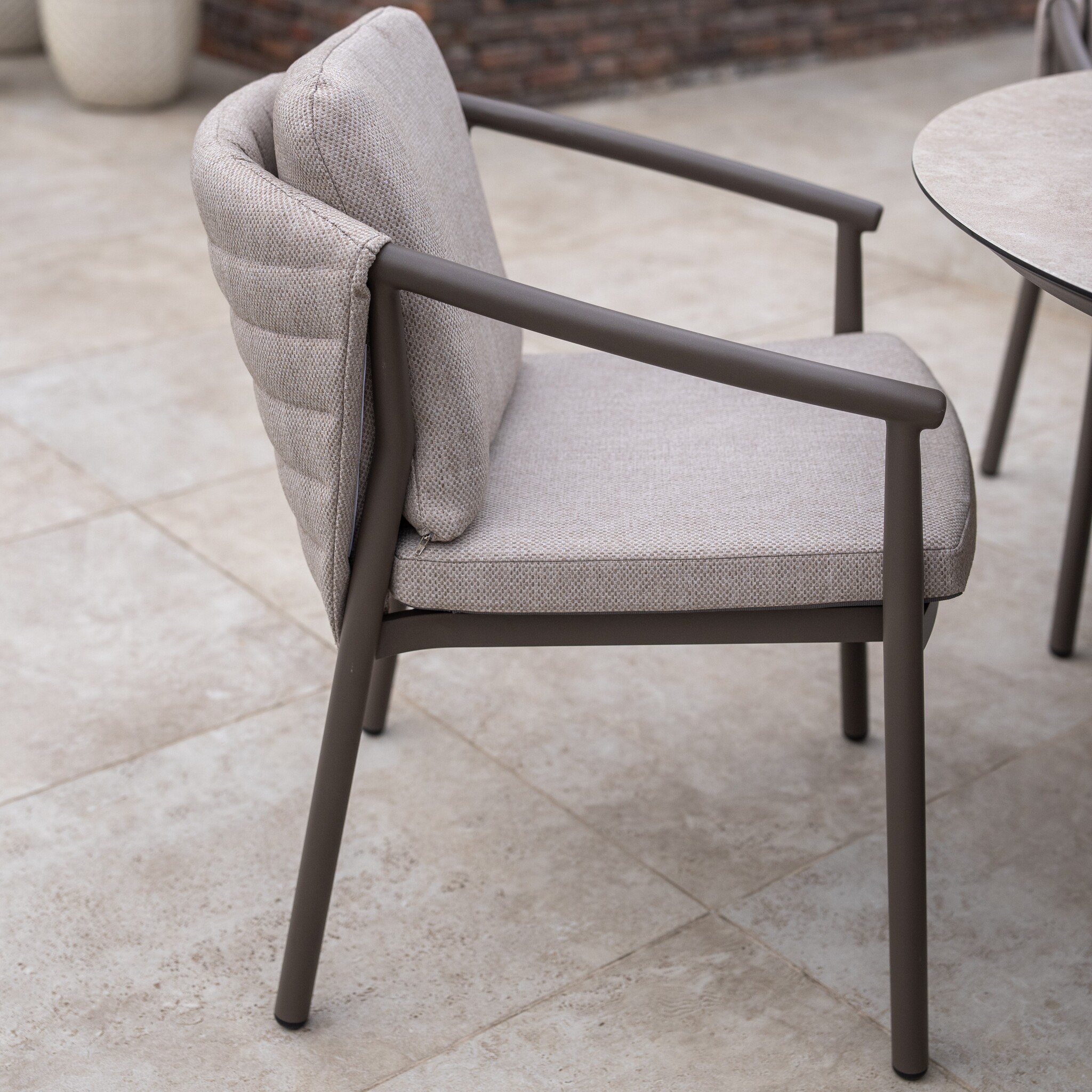 De stoel wordt geleverd met een comfortabel zit- en rugkussen in een neutrale, zachte kleur. De kussens zijn voorzien van een all weather vulling voor extra comfort en voorzien van een sterke, weerbestendige olefin stof die bestand is tegen een regenbui en snel droogt. Dankzij de ergonomische vormgeving en zachte kussens kun je met de Barolo urenlang ontspannen tafelen.